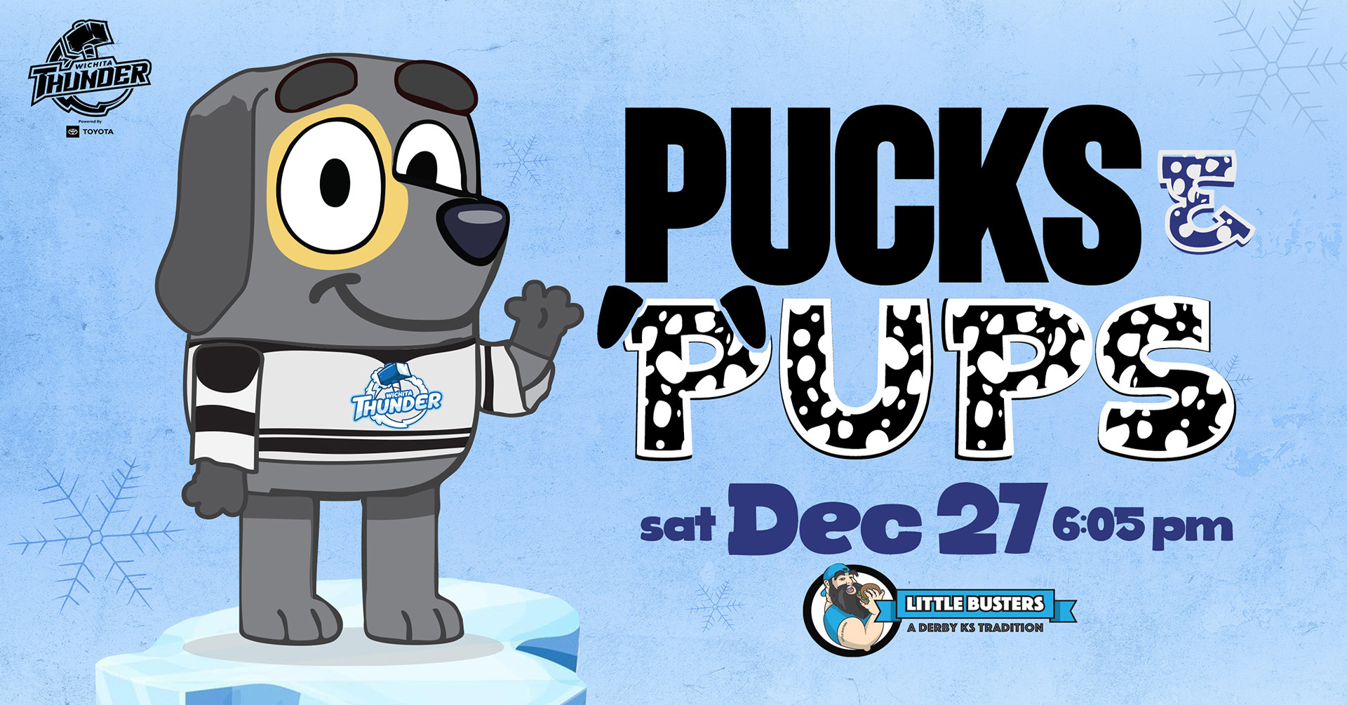 Bring your furry friend for our first Pucks ‘N Pups Night, presented by Little Busters Sports Bar & Grill. Fans will need to buy a human ticket ($20) and a dog ticket ($10). All dog ticket proceeds will help benefit the Kansas Humane Society and a local rescue. The game starts at 6:05 PM! Click the ticket link to purchase today!